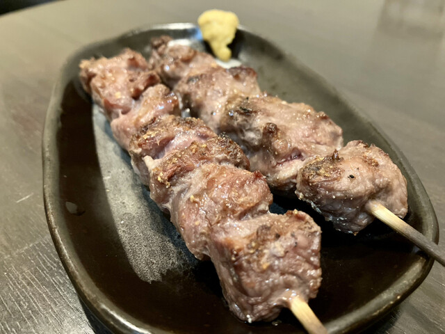 ☆「和牛串(税抜¥480)×2」意外にも初めて。ちょっとお高いですが、すごい肉汁でジューシー。さっぱりとした脂でくどくなく、軽い甘みもあります。甘さ控えめのタレがよく、すごく美味しかったです。美味しくておかわり、きっと次回もリピするでしょう…。