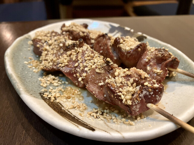 ◎「白レバ(ごま塩)(税抜¥220)×2」定番。白レバは半生に近く、ねっとりとした旨みを強く感じます。たくさんのごまのザクッと食感、ごま油も香ばしく、とても濃厚な美味しさです。