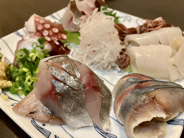 この時期のアジ・イワシは脂がしっかり感じられてフレッシュ。イカはねっとりとした旨みで美味しく、タコは普通の味わいでしたが、食感よし。