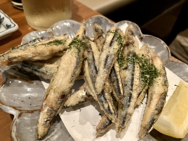 ○「きびなご塩焼(税抜¥680)」見た目が中々に壮観で、かなり大ぶりです。ふくよかな仕上がりで、軽い苦みと特有の旨みが十分に感じられます。