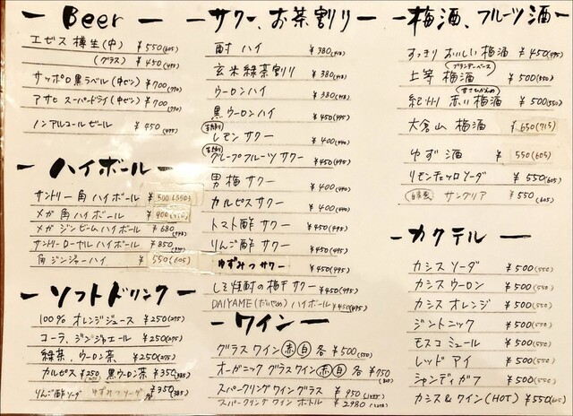 「エビス樽生(中)(税抜¥550)」「サントリー角ハイボール(税抜¥500)」「生搾りレモンサワー(税抜¥400)」「大分カボスサワー(税抜¥500)」「トマト酢サワー(税抜¥450)」