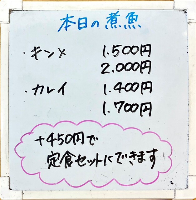 同じ建屋に魚屋さんも営んでおられますので、お魚の定食をいただくことにします。が、魚屋さんならではの珍しめな料理もあり、思わず追加注文してしまいました。