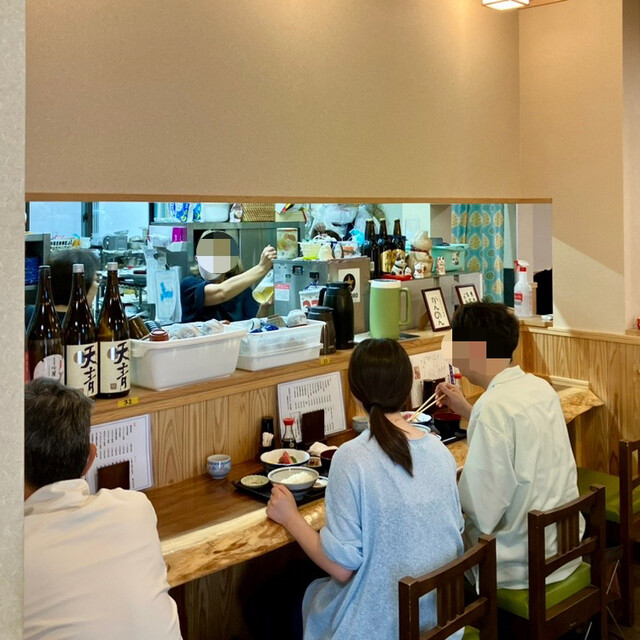 2023年5月に営業再開されていますので、お店は新しくきれいです。木目調の店内は明るく、座椅子のある小上がりがあり、たくさんのテーブル席で意外に広いです。4席ですがカウンターもあり、居心地のよい雰囲気で、みなさん昼飲みや食事を楽しんでおられます。