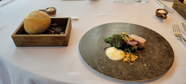 自家製和牛ベーコン、芹はフレッシュと根っこは素揚げ、チョロギのピクルス