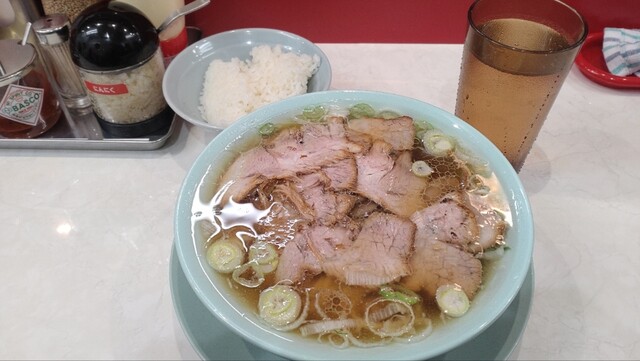 中華そばを無料のごはん(食券機のとこにある札を持参)とともにいただきました。