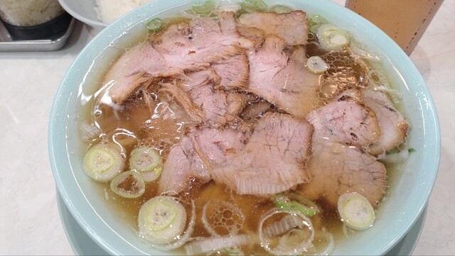 チャーシューは目の前で切っているのをドンと乗せて提供されます。薄切りですが食べ応えがありおいしいです。
