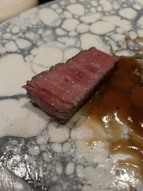 宮崎県産A5黒毛和牛。メークインのマッシュポテトに牛蒡スライス、赤ワインで炊いた洋風おかかがかかっています。黒胡椒のソースが深みがありとても美味しいのですが、それを上回る抜群の肉質でございました。ああ、美味しい。