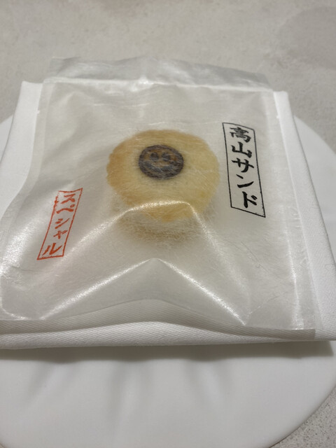 高山サンドは市販品のようにパッケージされた、トリュフ入りアイスのクッキーサンド。スマイルマークの焼印が香ばしい苦味としてアクセントになっており、美味しいです。