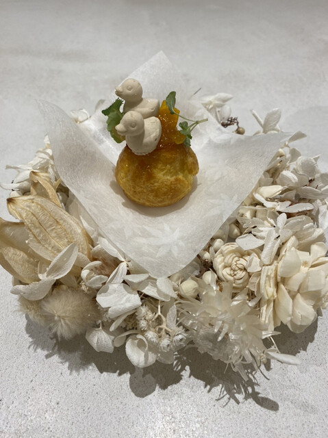 次はシュー生地の中に入ったフォアグラクリーム、w/上には小さなガチョウさんが二羽。フォアグラの臭みもなく、大変美味しくいただきました。