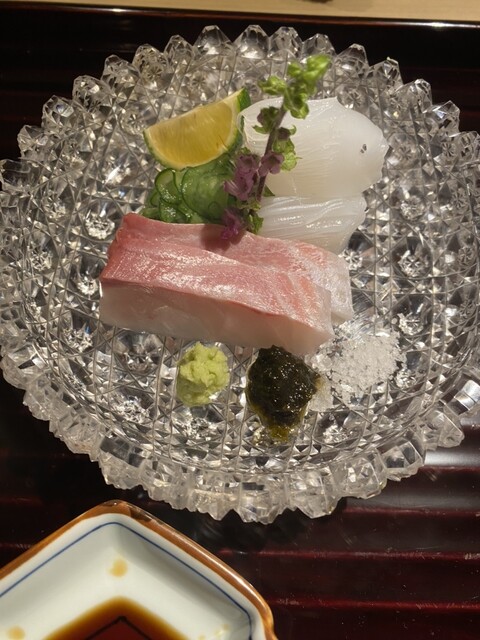 石鯛とアオリイカのお造り。イカは新鮮なのに熟成されたかのようなねっとり感があり、甘くとても美味しい。石鯛はやたら脂が乗っていてびっくり。魚は長井漁港から、かのさかな人・長谷川大樹氏が神経絞めしたものを取り寄せているんだそう。