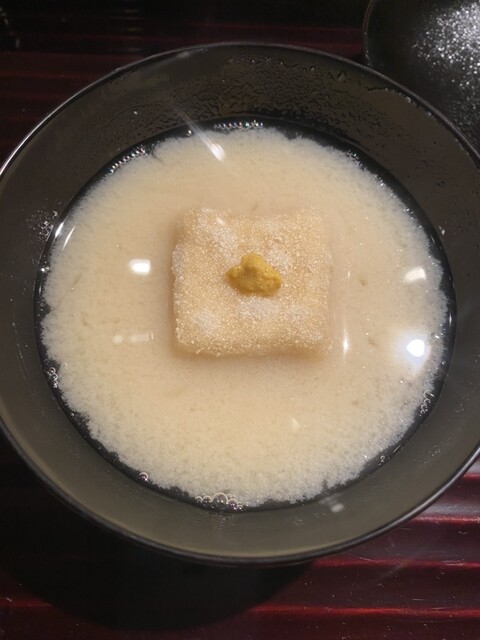 胡麻豆腐入りの白味噌のお椀。白味噌に負けて胡麻豆腐はさほど味を感じない。白味噌の味噌汁さえあればノーマル豆腐、なんなら具なしでも構いませんw