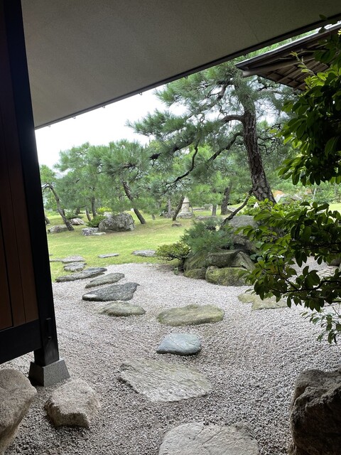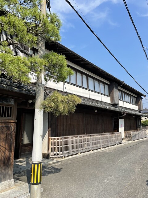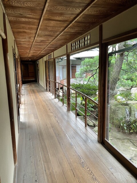 樹齢200年の松と遠方の趣ある建物は四代目のご夫妻の私邸