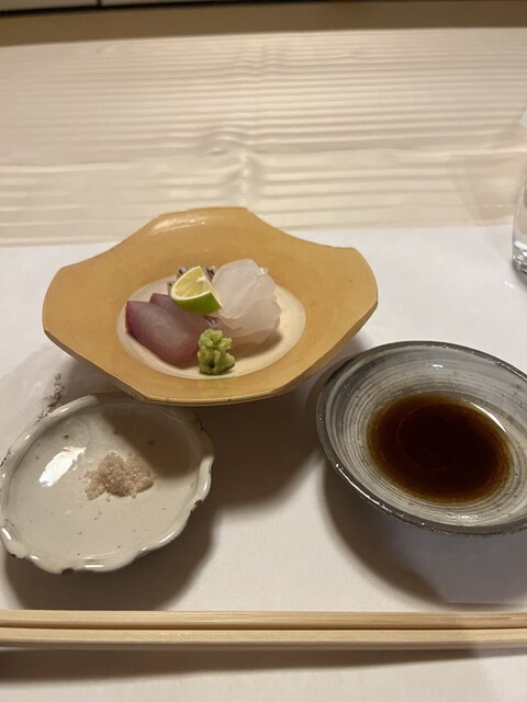 『御造り』オコゼ、芽ネギ、酢橘 藻塩と芽ネギを巻いたオコゼは醤油よりもインパクトありました