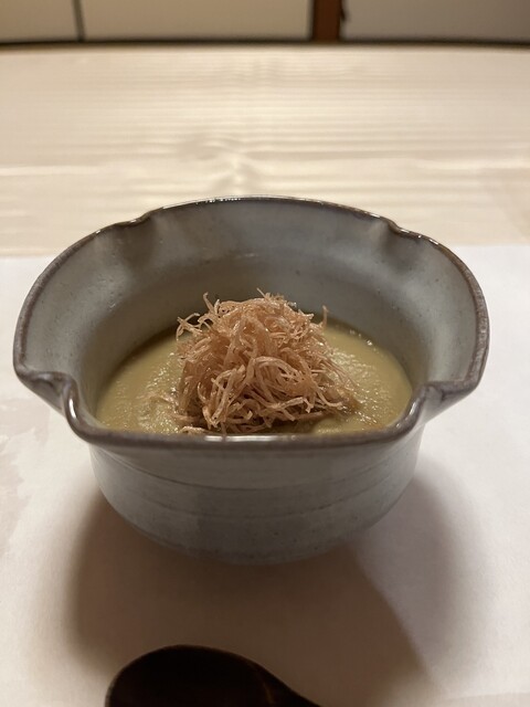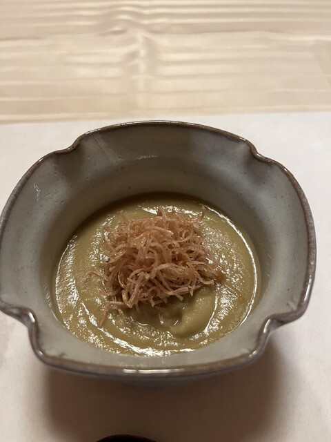 ⦿『炊合せ』丸茄子のすり流しにとろろスルメ <変化球ながら、ほのかな香ばしい茄子のすり流しとスルメを味わうと、何故か安堵感に満ち溢れる>