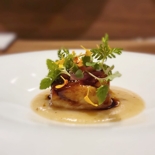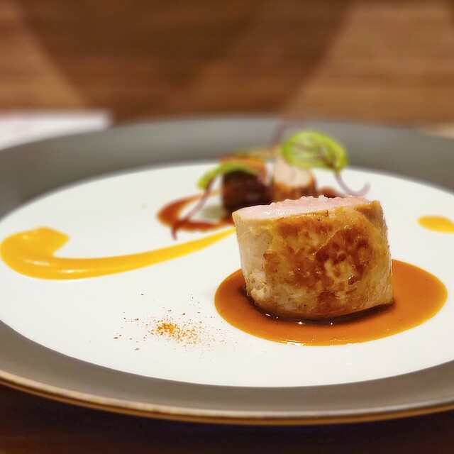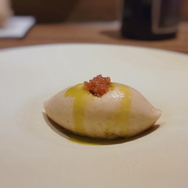 国産のオリーブオイルがかけられ、上にはキャビアライムがあり、洋梨の瑞々しさに添加されて美味しかったです。