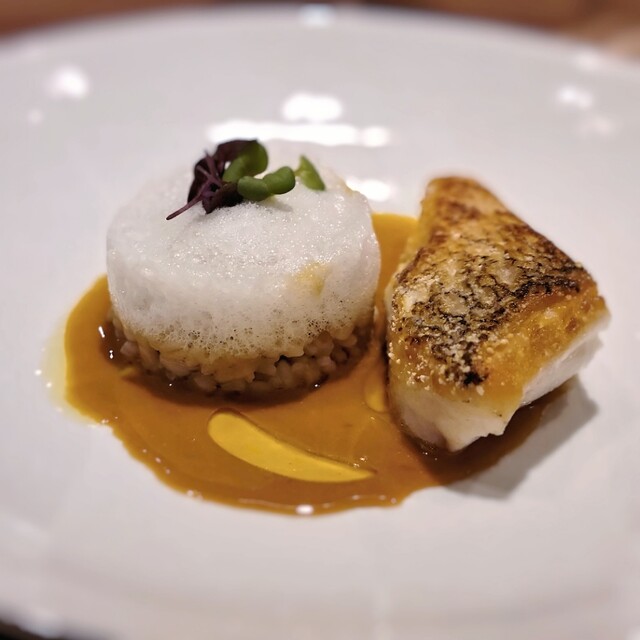ソースは甲殻類の出汁で作られたもので、力強い旨味です。白甘鯛のポワレも付け合わせのリゾットも美味しくなりました。