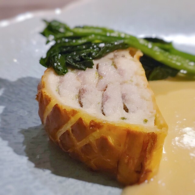 鮎は身だけを綺麗に並べ、まわりに帆立と鮎のムースがありパイで包んで焼き上げています。