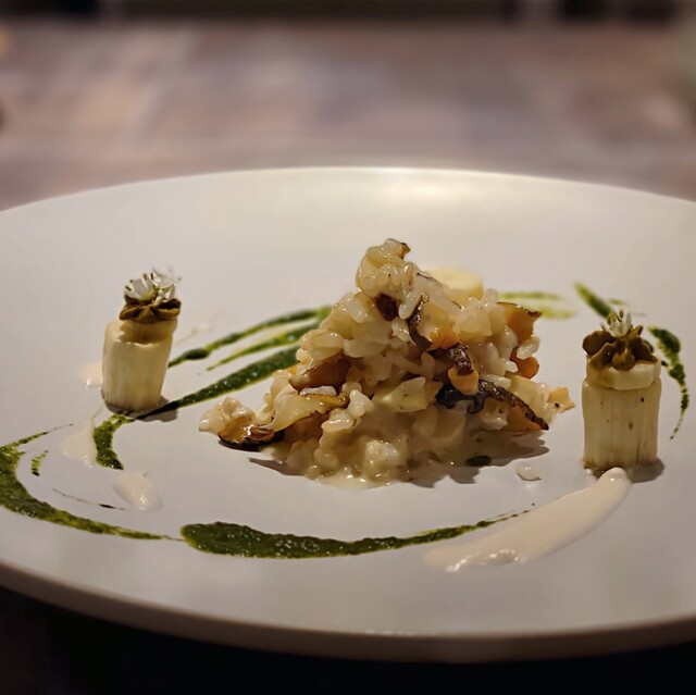 いすみ市の沖合いに広がる機械根という漁場のサザエを使った玄米のリゾット。玄米はつるかめ農園の優しい味わいのお米で風味良くサザエと良く合います。