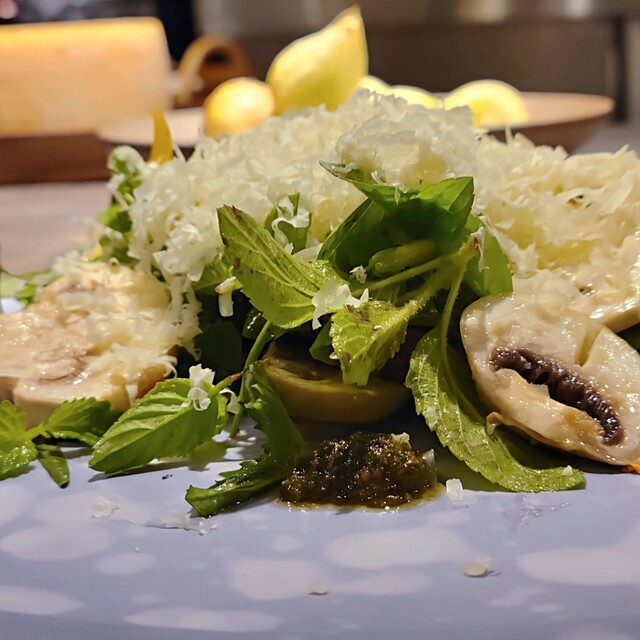 シェフが目の前でムチュリチーズをたっぷり削ってくれます。ハーブは苗目農園のもので香り高く、力強いものでサラダ仕立てにしています。