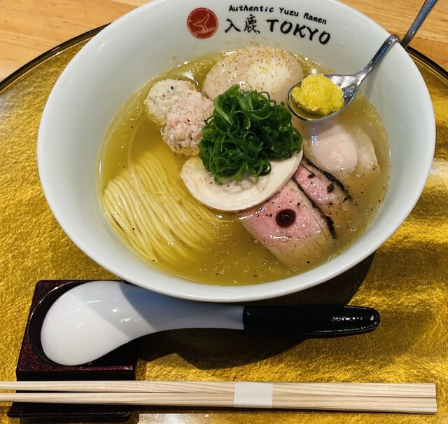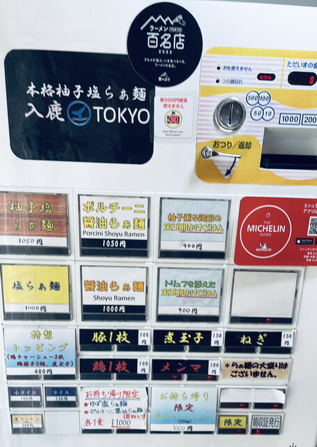 券売機で柚子塩らぁ麺とポルチーニ醤油らぁ麺、それぞれに特製トッピングをオーダー。さらにトリュフを添えた宝玉卵かけごはんをシェア発注し8席あるカウンターの中央付近へ。