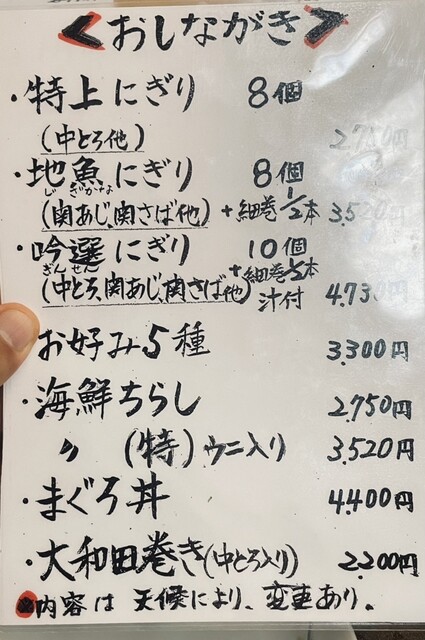 次いで、特上にぎり(8貫)を発注。いか、中トロ、玉子、煮蛸、アラ、煮穴子、こぼれいくら、中トロ鉄火巻、あわび。あれ?1貫多くない?