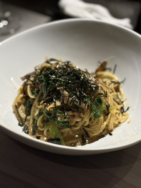 ワインを頂いてもしっかり食べるノンは、いつものように明太子とかつお菜とキノコのスパゲティを
