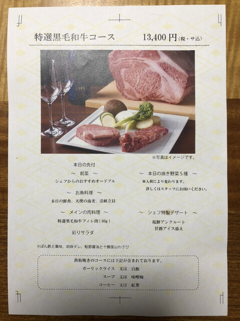 「3月特選黒毛和牛コース」13,400円のコースを2名で予約、お祝い事で使用することを告げると、デザートプレートに記入する文言を聞かれるのと、無料で記念写真のサービスを受けれるのでその希望の有無を尋ねられます。
