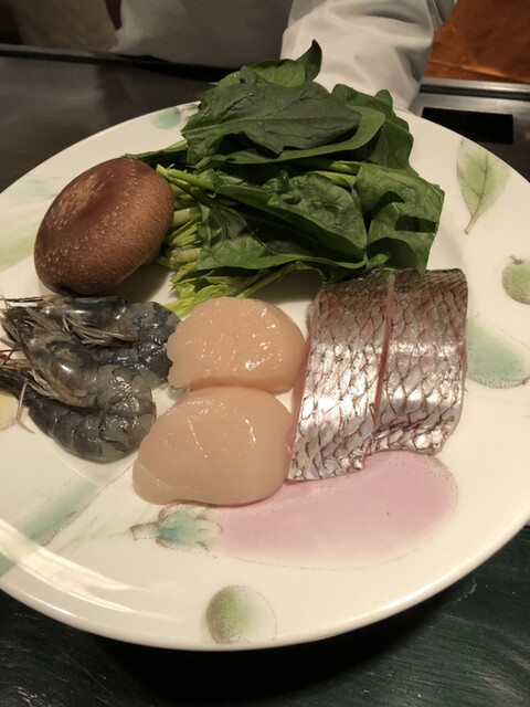 本日のお魚食材「真鯛、ホタテ、エビ、椎茸、ほうれん草」の調理が始まります。