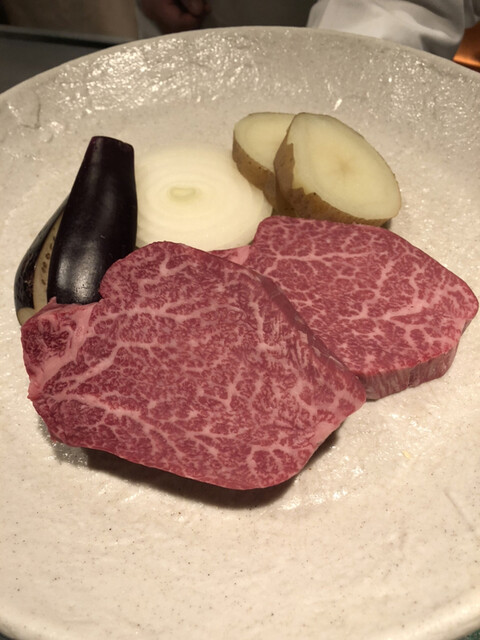 サラダを挟み、メインの肉は黒毛和牛フィレ80g、ナスビ、ジャガイモ、玉ねぎが用意されてます。