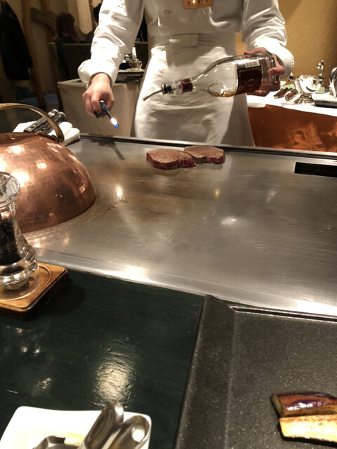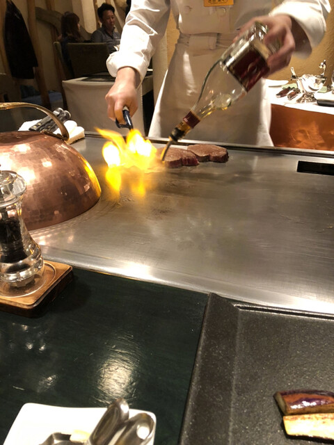 肉の焼き加減はシェフおすすめのミディアムレアでお願いします。鉄板の上で蒸したり、フランベやナイフでのカット調理はパフォーマンスとしても楽しめます。