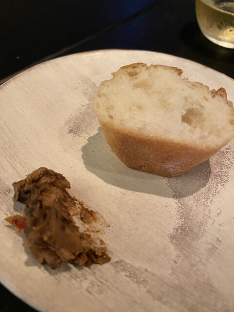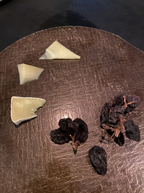 5品目と6品目の間には、黒ニンニクにセミドライトマトをまぶしたクリームチーズが供えられたフランスバンもありました。黒ニンニクの香りが広がるクリームチーズは食べやすく、パンとの相性も◎