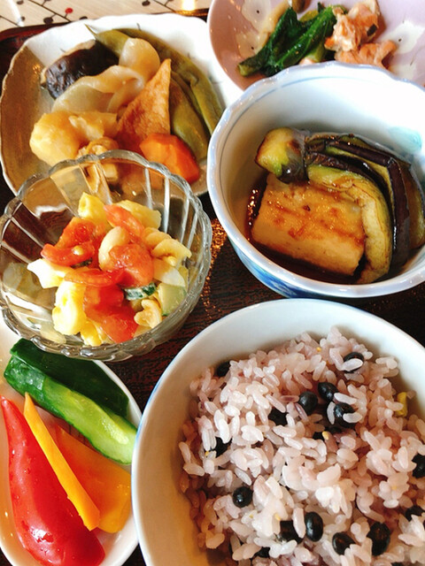 8皿に雑穀米と具沢山のお味噌汁です。野菜中心のメニューなのですが、どれも味が染みてしっかりしていて、とてもおいしくいただけます。