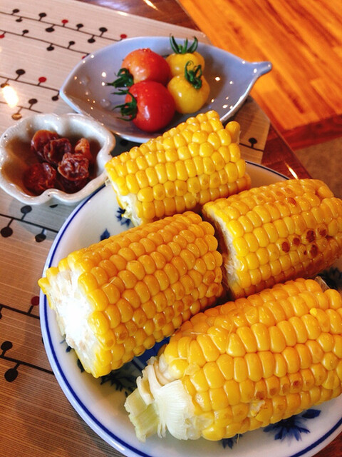 食事を半分ほど食べた頃「これ、うちで採れたものだけどどうぞ」とトウモロコシ とミニトマト(プチプニという品種)、ドライトマトをいただきました。更にご飯のおかわりできますよと声かけいただきましたが、もうもうお腹いっぱい、この後のデザートの入る心配すらしなくては。