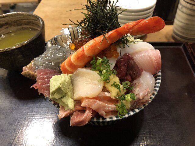 いつも通りにスタンダードの海鮮丼にご飯別大盛り、魚汁をつけてオーダー。