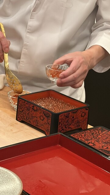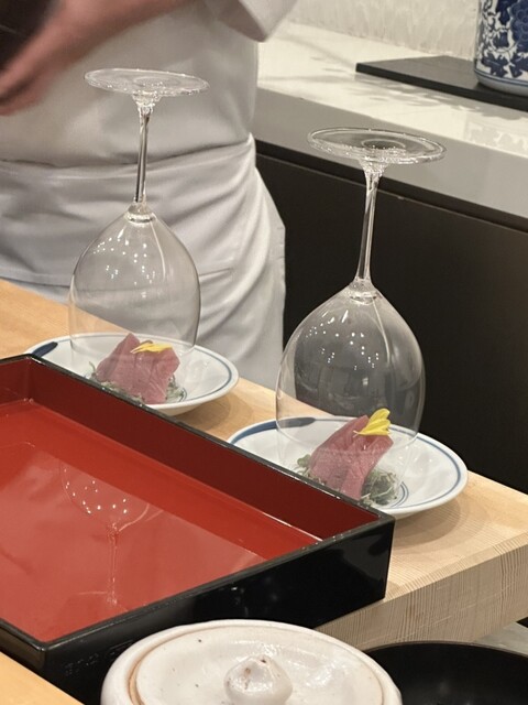 目の前で香りも堪能し、そのグラスに日本酒を注いでマリアージュも楽しめる粋な演出!