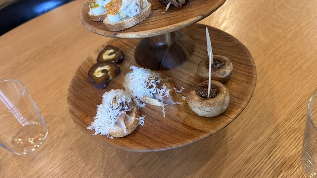ピンチョス(バイ貝.鰤マヨ.???.生ハム詰めマッシュルーム.酢漬け鯖とマンチェゴ.柿クリームチーズ)