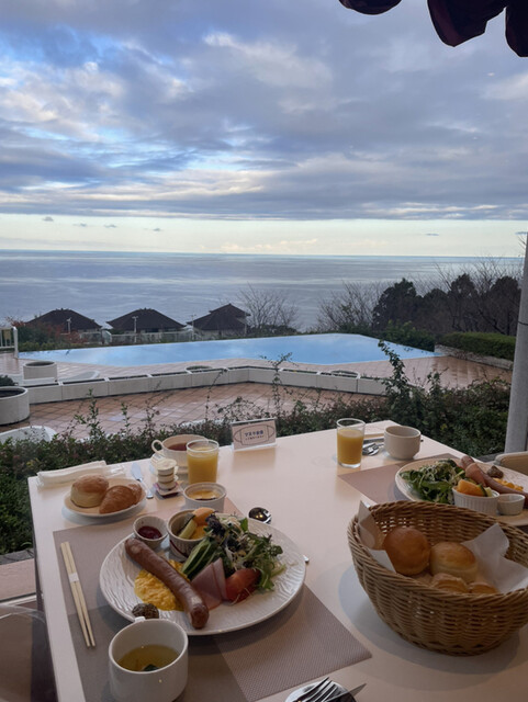 夜の眺望は真っ暗ですが(*^^*)お席から見える景色は変美しいパラデシアと一面が穏やかな海!素晴らしいです。