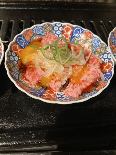 ユッケ 甘ダレと卵とユッケがあわさってクリーミーです。最高に美味しい。