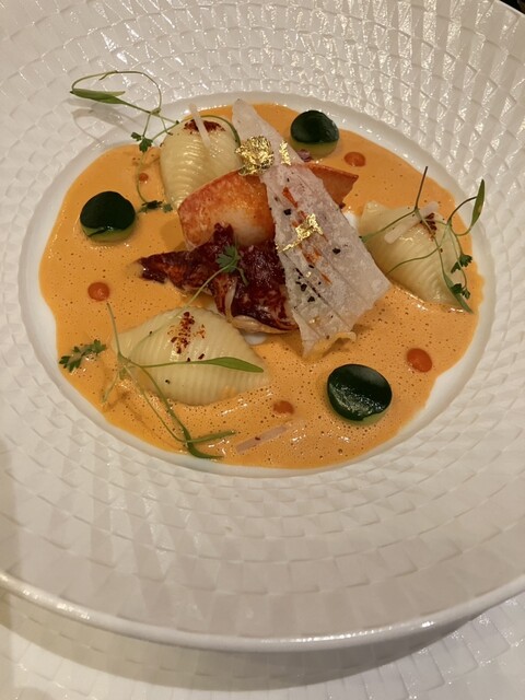 ヨーロッパ産オマール海老、中に貝のパスタも入っています。ソースが濃厚でオマール海老を存分に引き立てています。