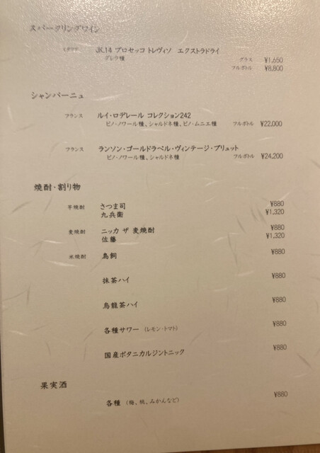 ドリンクはビール、ワイン、ウイスキーから日本酒まで頂きましたが、どれも厳選されたもので、料理に合う、かつ甘味・酸味・辛味・苦味・渋味のバランスは満足のものでした。