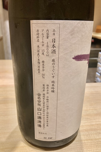 店主おすすめの日本酒では、佐賀県七田ひやおろし、福岡県庭のうぐいす特別純米、兵庫県黒龍大吟醸龍を頂きましたが、