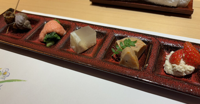つぶ貝、雪ノ下と明太子、クエの煮こごり、あん肝、豆腐と苺