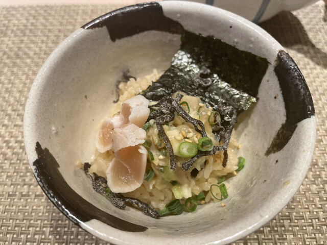 〆物(昆布締めササミ、なめろうの乗った鶏出汁で炊いたご飯、鶏出汁の茶漬け)