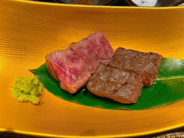 牛串(内もも、サーロインのステーキ仕立て、九州の甘醤油を添えて)