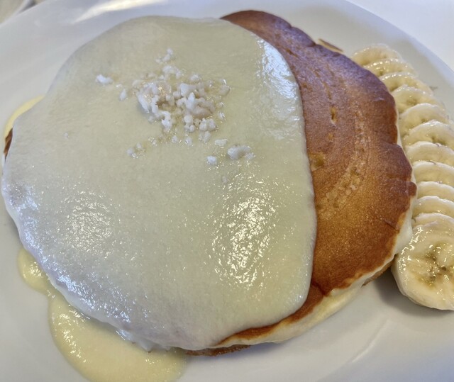 少しの塩気に甘すぎないクリーミーな白いオリジナルナッツソース、程よいナッツの風味が後から押し寄せ、絶品です。バニラアイスクリームと合わせると最高で、バナナとパンケーキの相性も言わずもがな、甘み・旨みを求め、ナッツ好きにはたまらないパンケーキでした。