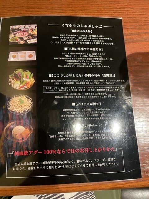 公益社団法人沖縄県家畜改良協会でDNA鑑定を行い琉球在来豚「アグー」の証明を受けており、きちんと最初に説明を受け、いろいろな質問にも答えていただける為、食事の知識や満足度、ホスピタリティとしても大満足です。
