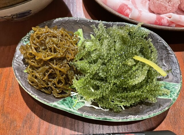 また野菜も新鮮かつ種類も豊富で、最高級のアグー豚に合わせるために、沖縄県内各所で採れる野菜を使用しており、沖縄でしか頂くことの出来ない珍しい野菜、島人参、島らっきょ、田芋、青パパイヤ、オオタニワタリ、ハンダマ、もずくなどを頂けました。