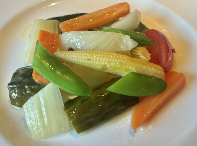 とにかくまず最初に出てくる”冷製季節野菜の蒸し煮 コリアンダーと共に”は、どうすればここまでシャキシャキ新鮮かつ歯ごたえ良く、甘味・旨味深い野菜ができるのかと不思議なくらい美味しいプレートでした。