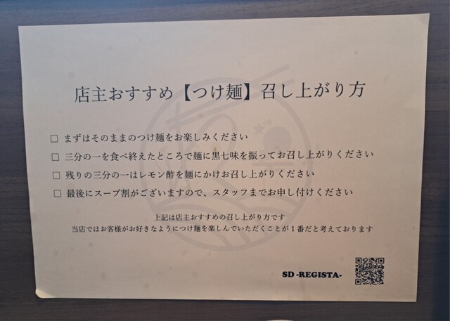 さてまずは麺を一本頂きます、つやつやした太麺、弾力があります。続いてスープにドボン、ウマイ!数年のブランクが悔やまれる。テーブルに貼られたお勧めの食べ方に従い、1/3食べた頃に黒七味を麺に振りかけます、パンチの効いた辛味が味を変化させてくれます。ウマイ!更に1/3食べたらレモン酢を麺にかけます、爽やかな酸味で一気に完食です、ウマイ!