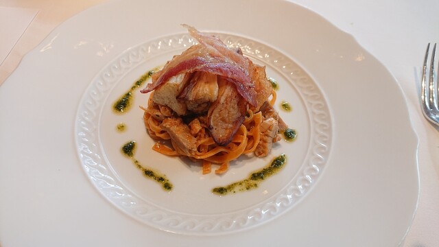 ・唐辛子のタリオリーニ ナス 自家製ツナ パンチェッタ